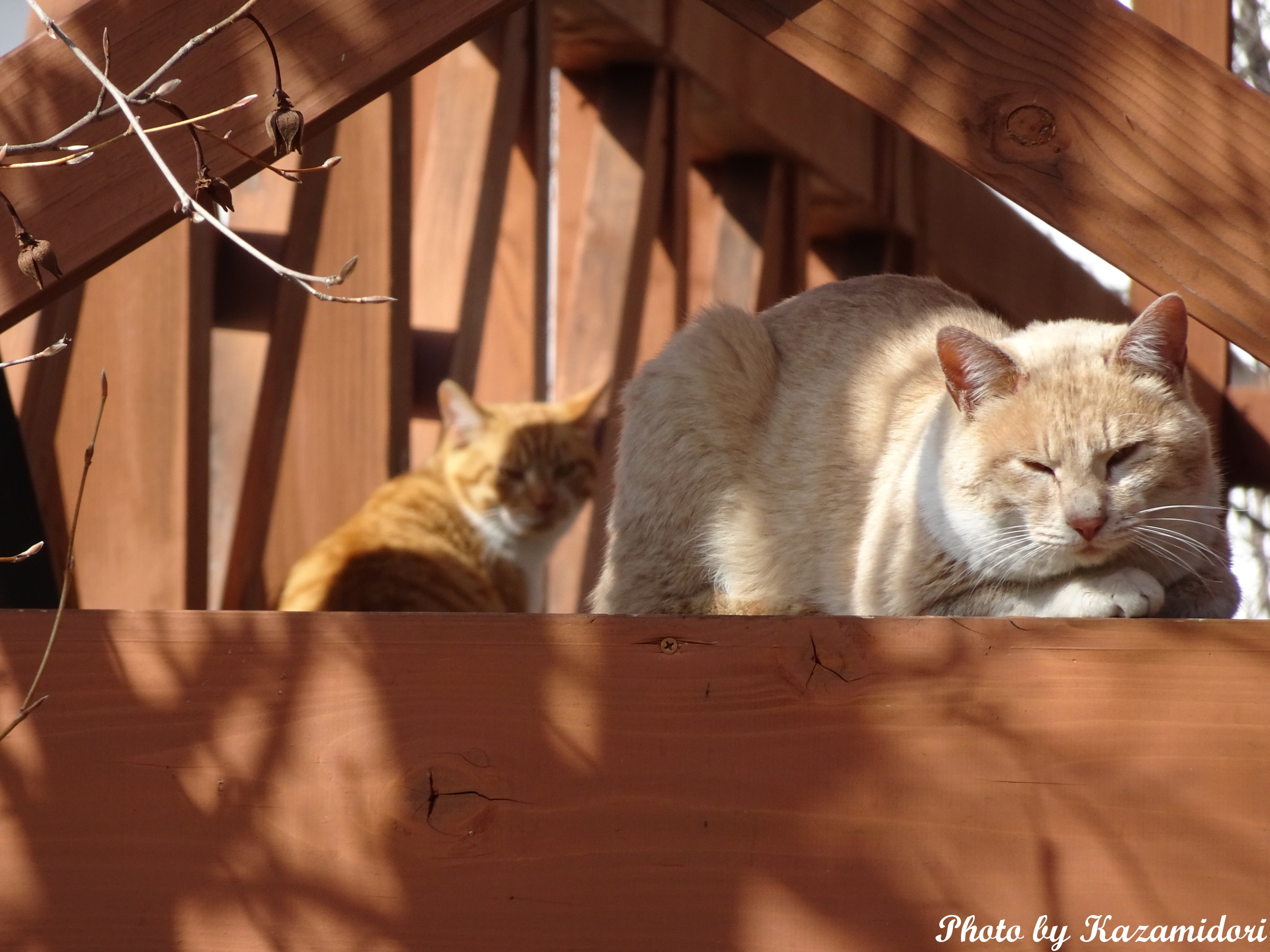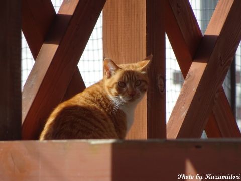 今朝、茶白がいたあたりに、今度はこのミケ子がいた。このまえ、ここから1キロほど離れたあたりで見かけたのだが、天気が悪いからだろうか、この宿泊施設のベランダで休んでいる。