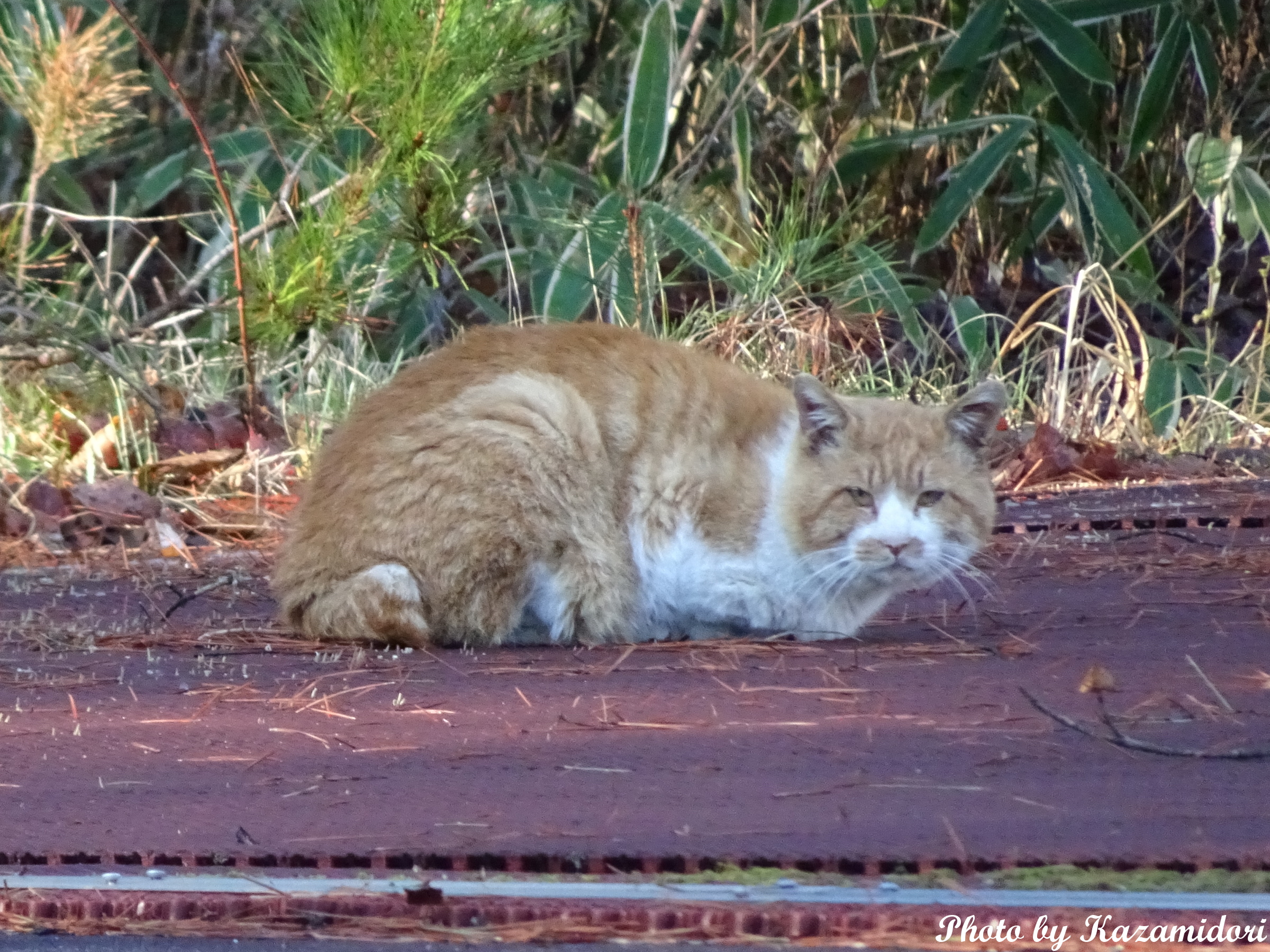 いつもの辺りに、この茶白がいた。芝は濡れているはずなのだが、冷たくないのだろうか。