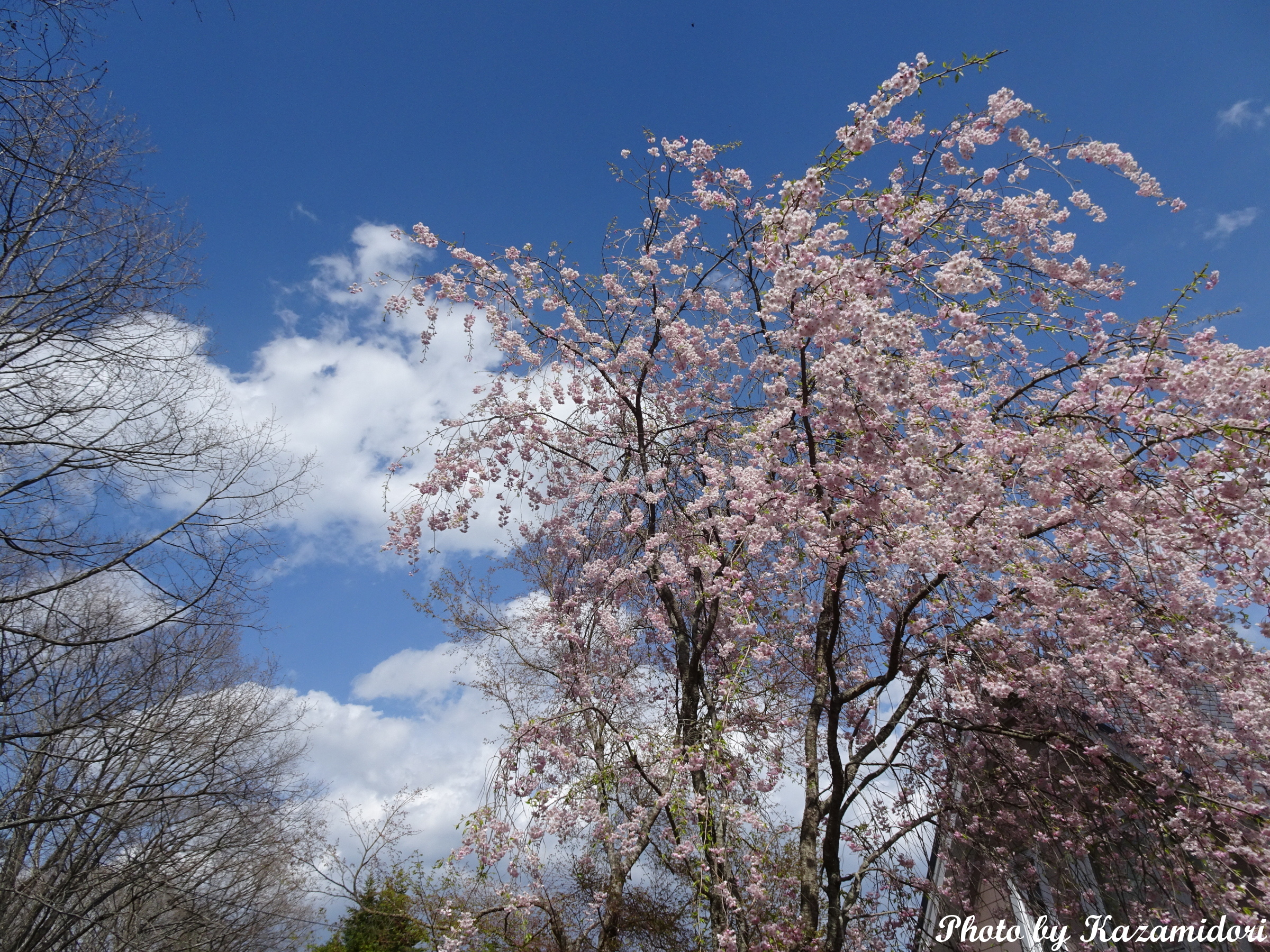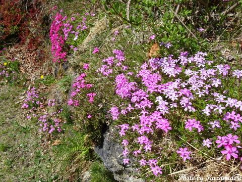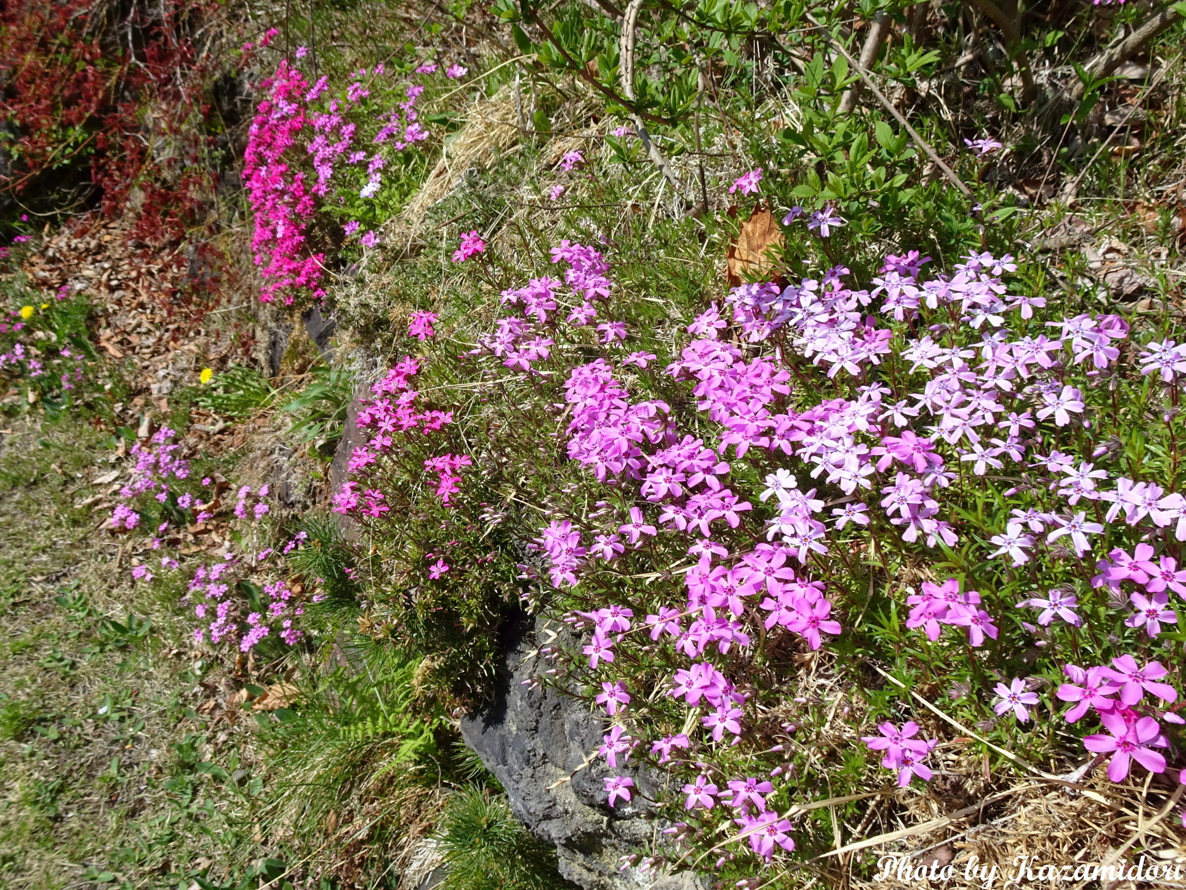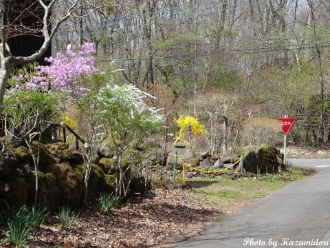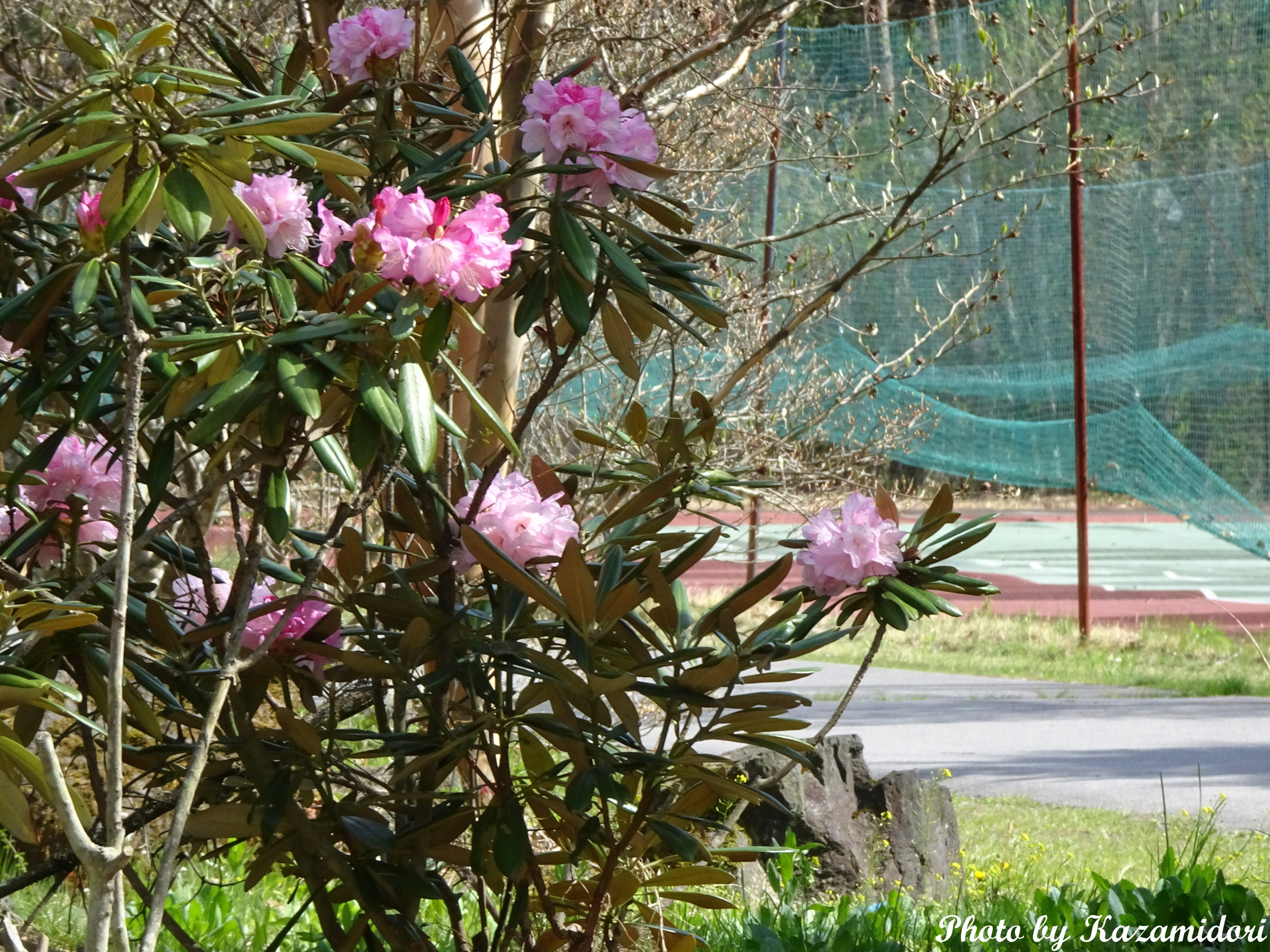 散歩は、すっかり緑になった桜の木を横目に、こんなツツジとか、まだ咲いている八重桜とかを見ながら歩く。