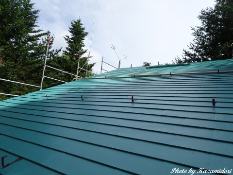 長引いていた別宅の屋根のリフォーム工事もようやく完成して、あとは足場を撤去するだけとなっている。下は完成直前の状態。