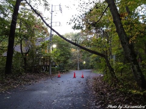 ただ、やはり少し天気は不安定。午後はちょっと某団体のWG関連の作業をしていたのだが、その間にひと雨あったようで、道路が濡れていた。明日はまた曇り空の一日になりそうである。秋晴れの日が続かないのは、ちょっと面白くない。そうこうしている間に冬になってしまいそうである。夕方少し散歩に出たら、なにやら道路が通行止めになっている。道の脇の木が折れてしまったようで、こんな感じで倒れかかっている。道の反対側には電線やら光ケーブルが通っていて、それらに引っかかっているようだから、切れて、停電とか通信障害とかにならなければいいのだが・・・。