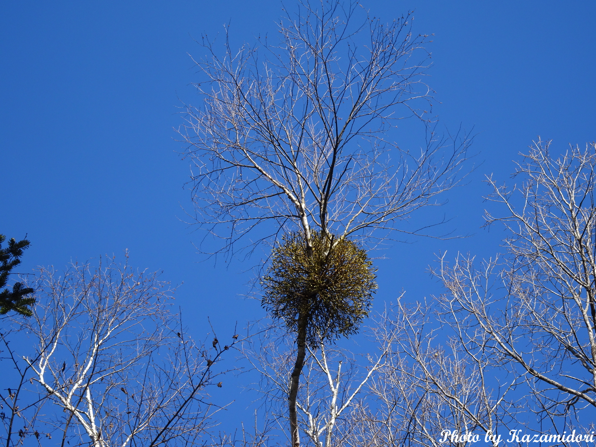 流石に朝は寒くて歩けず、昼過ぎに少し歩いたのだが、足元が凍っていてちょっと危険。すっかり葉が落ちた木の枝に宿り木があらわになっている。宿主の葉が落ちた冬場が、日光を浴びるチャンスだ。