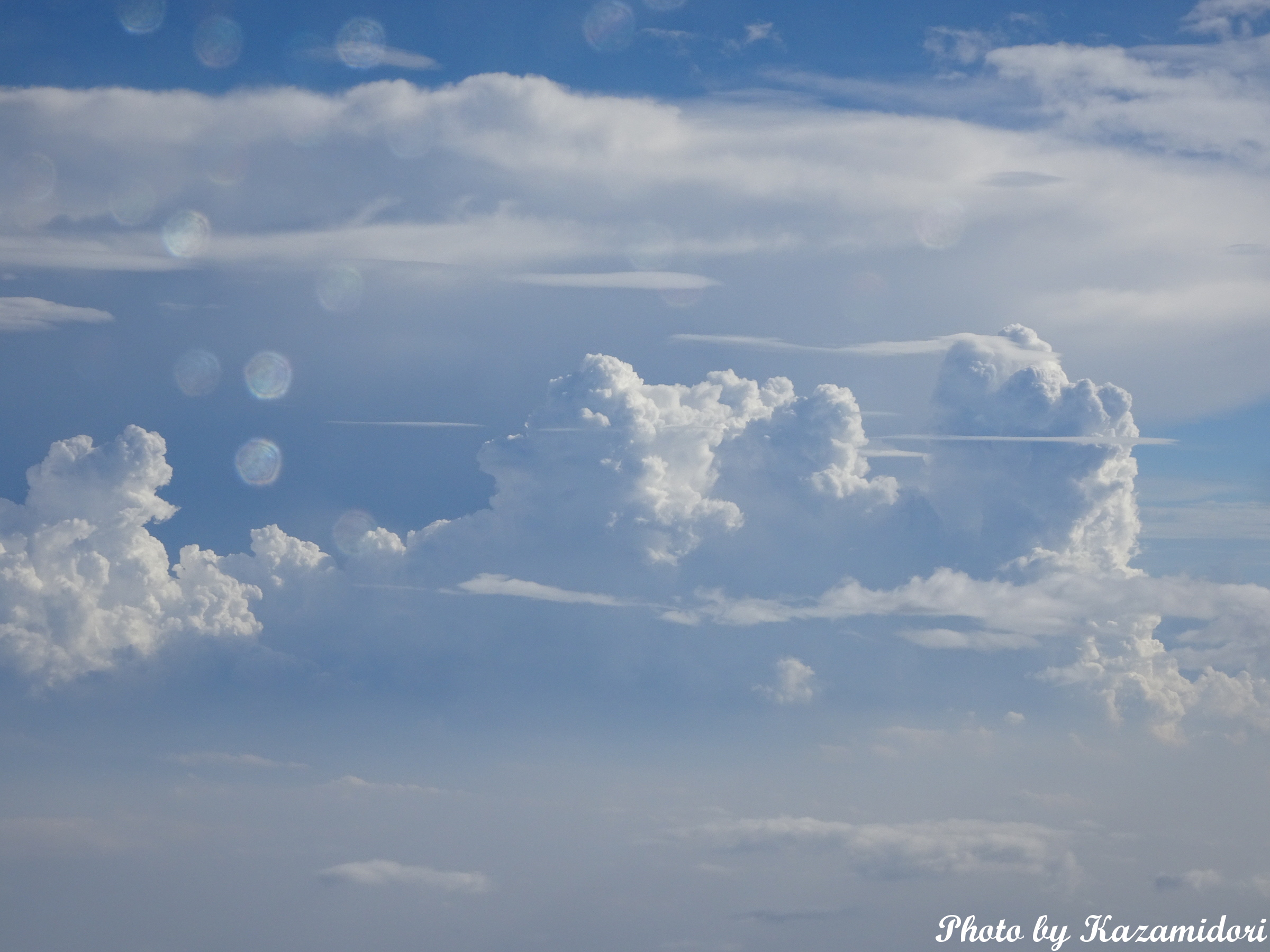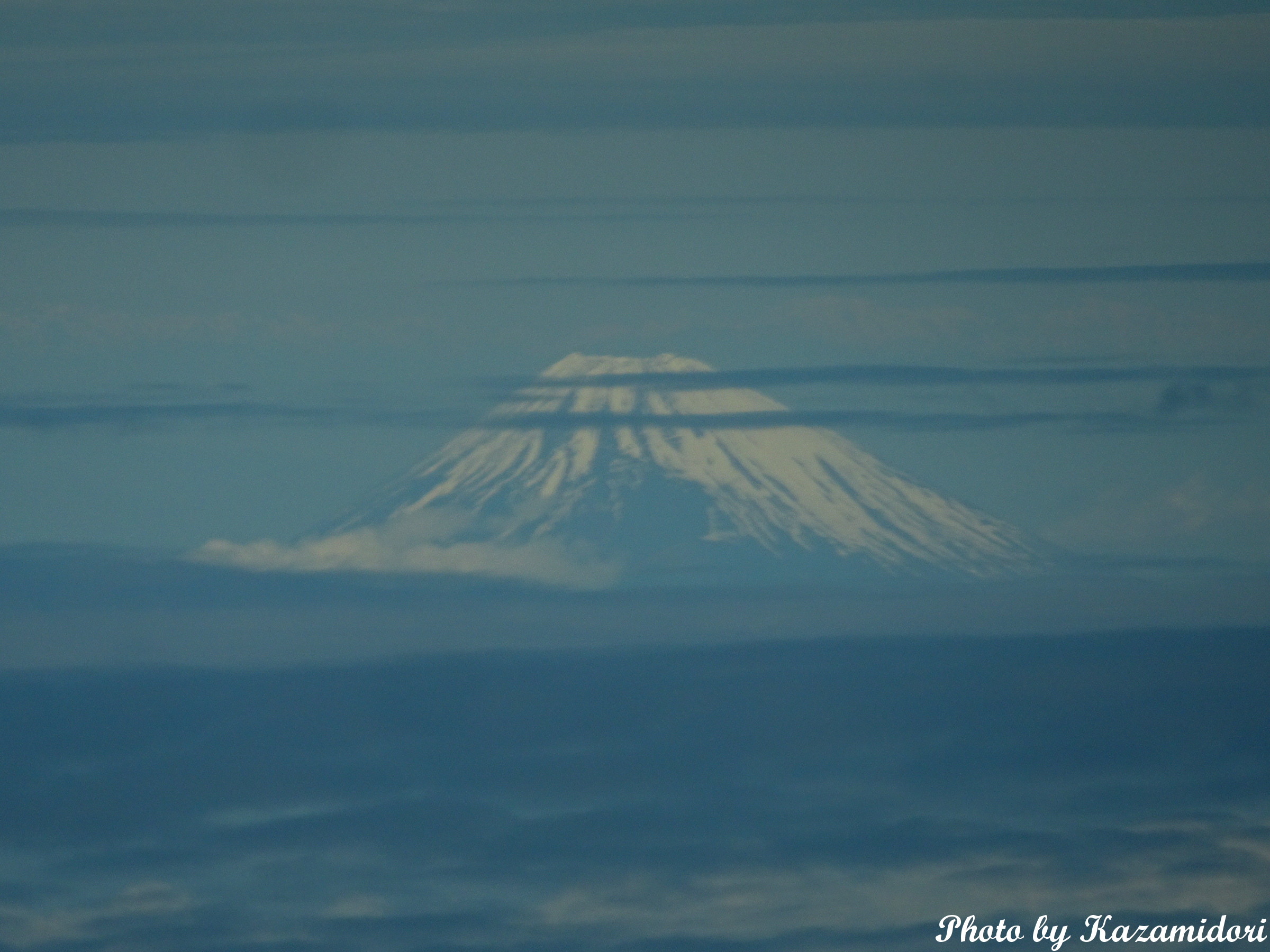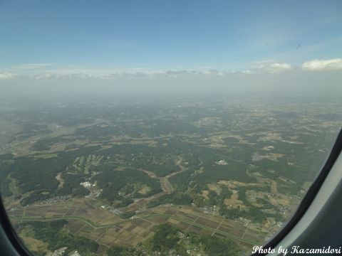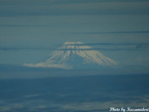 右側の座席を選んだのは、太陽と反対側なのと富士山が見えるからなのだが、今回はいきなり陸地から離れたコースをとったので、肉眼では遠くの方にかうろじて見えただけ。それも雲に邪魔されて短時間しか見えなかった。とりあえず、カメラでかなりズームして、それらしい絵にはできた。