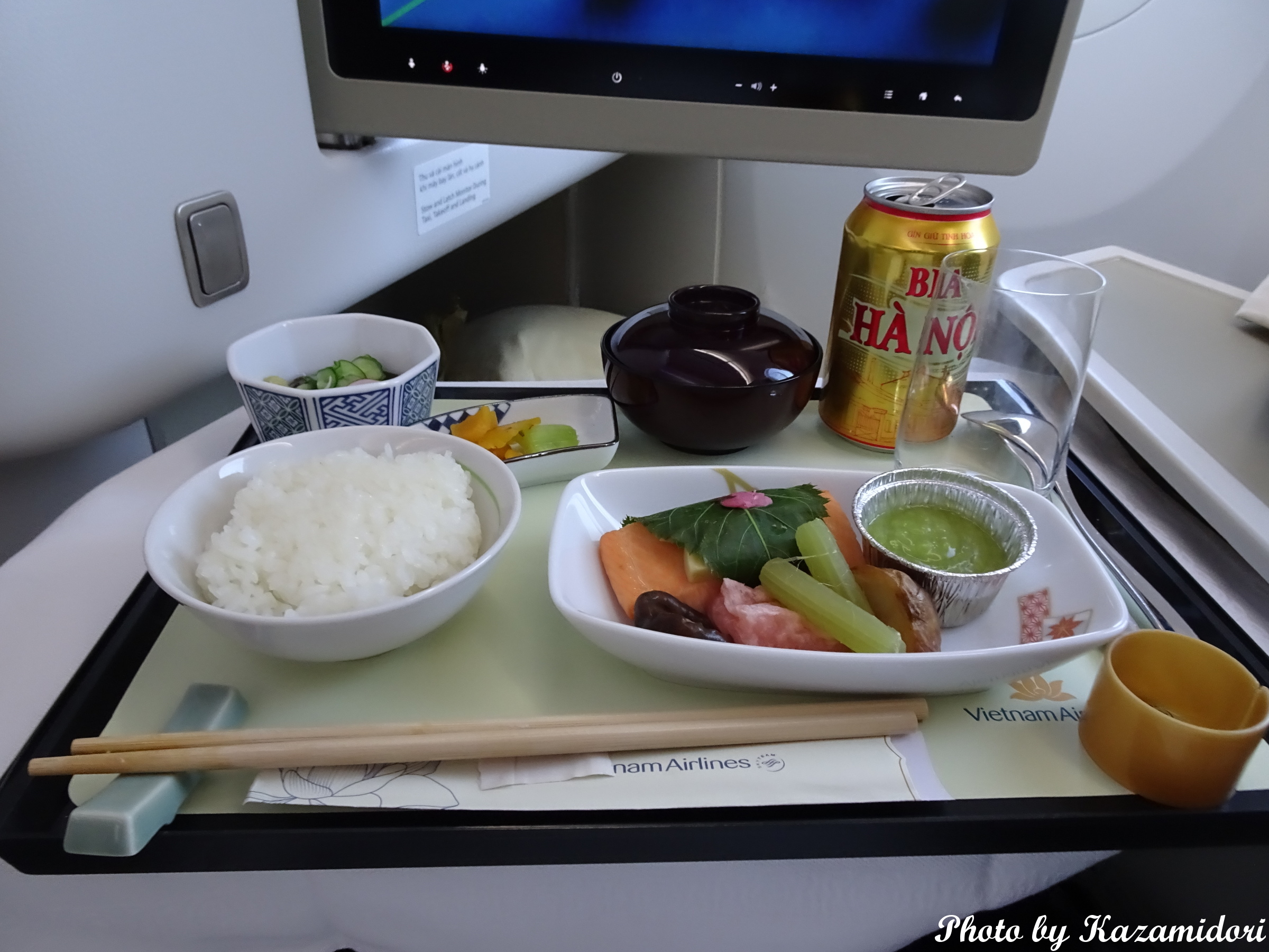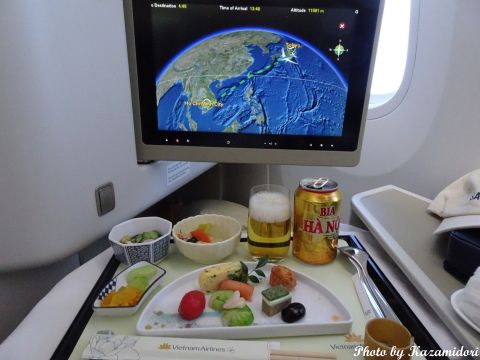 昼便なので、機内食は昼食扱い。和食をたのんだのだが、割といい感じだった。これは、前菜。ビールはベトナムのものである。