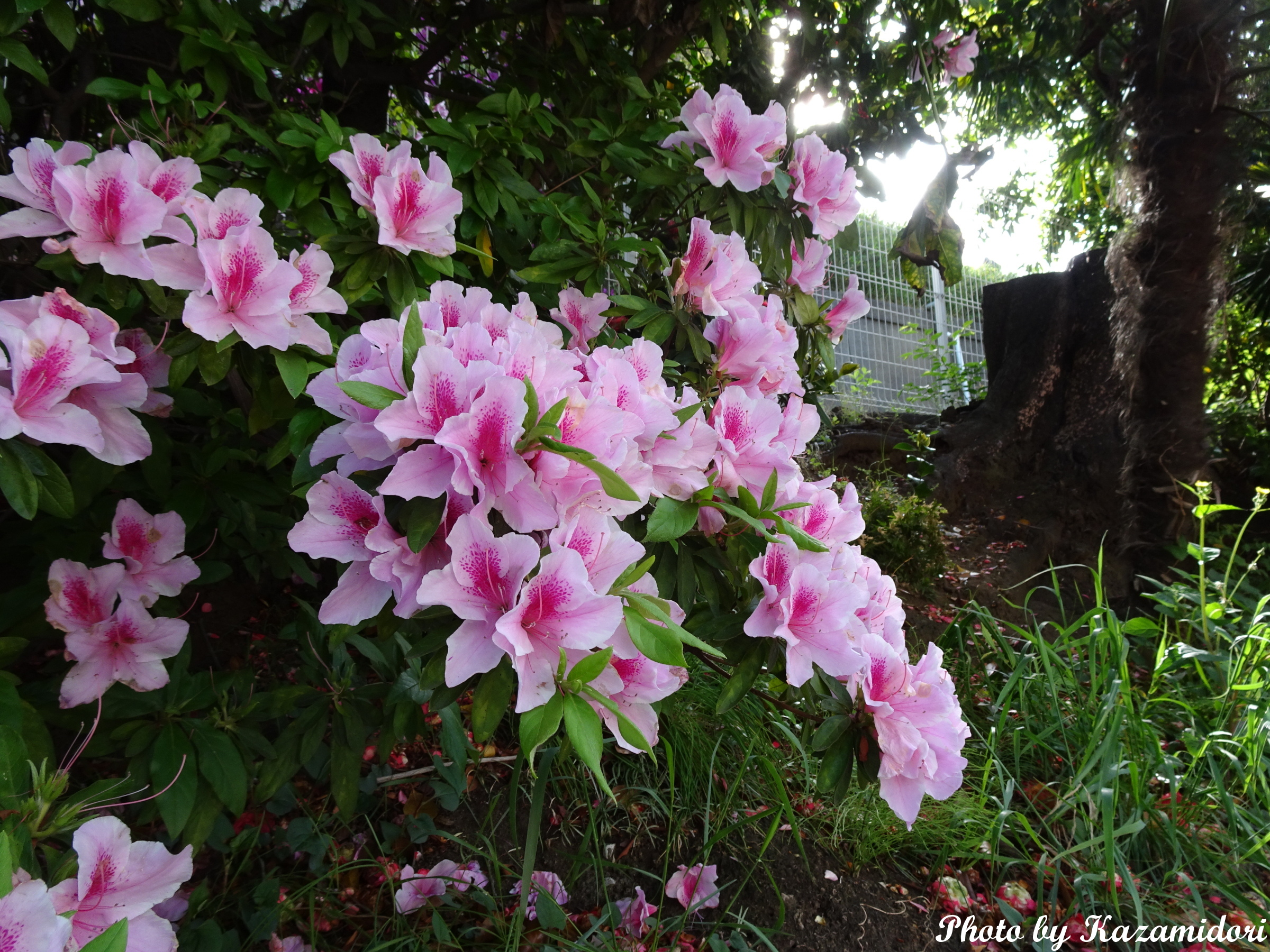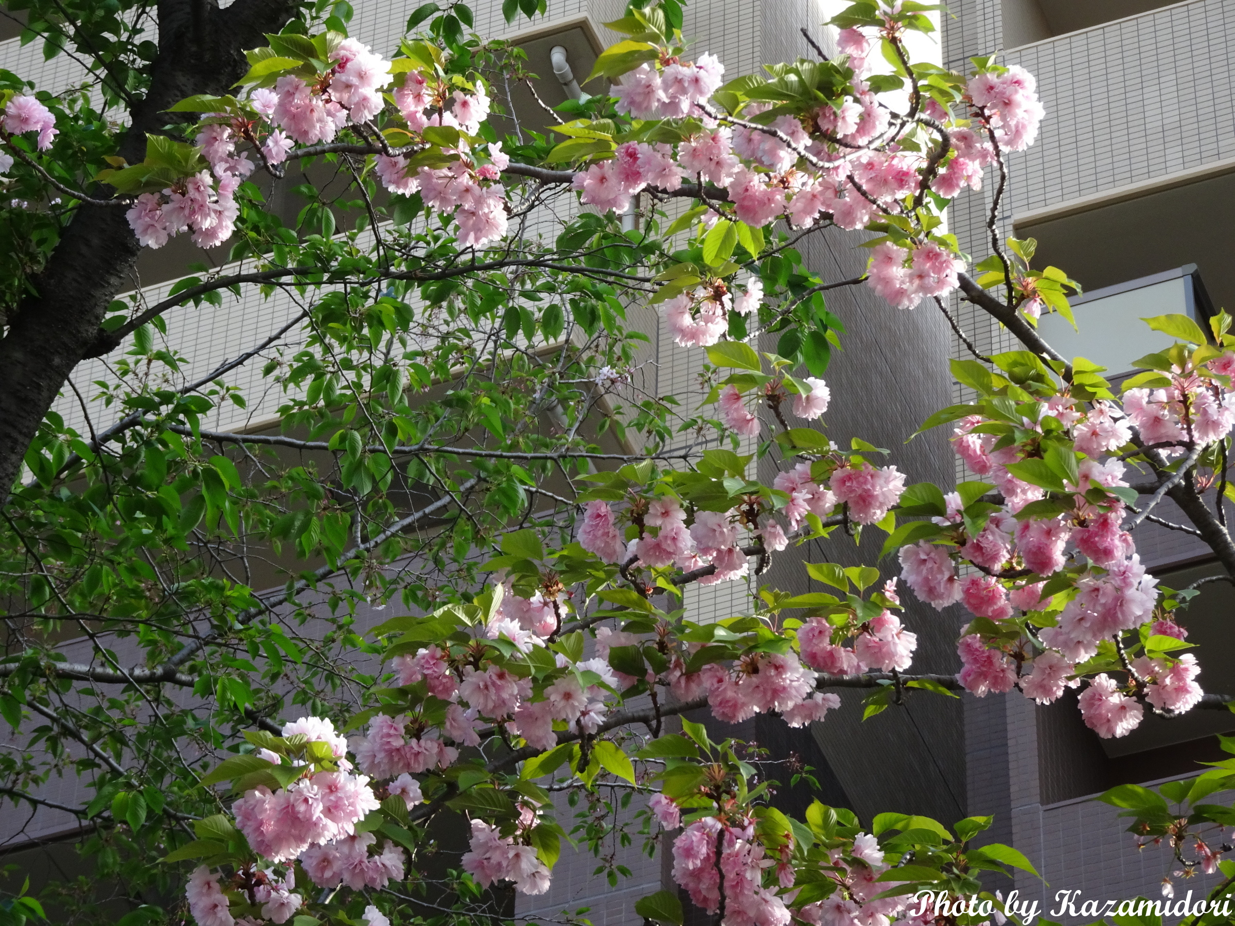 散歩は、すっかり緑になった桜の木を横目に、こんなツツジとか、まだ咲いている八重桜とかを見ながら歩く。
