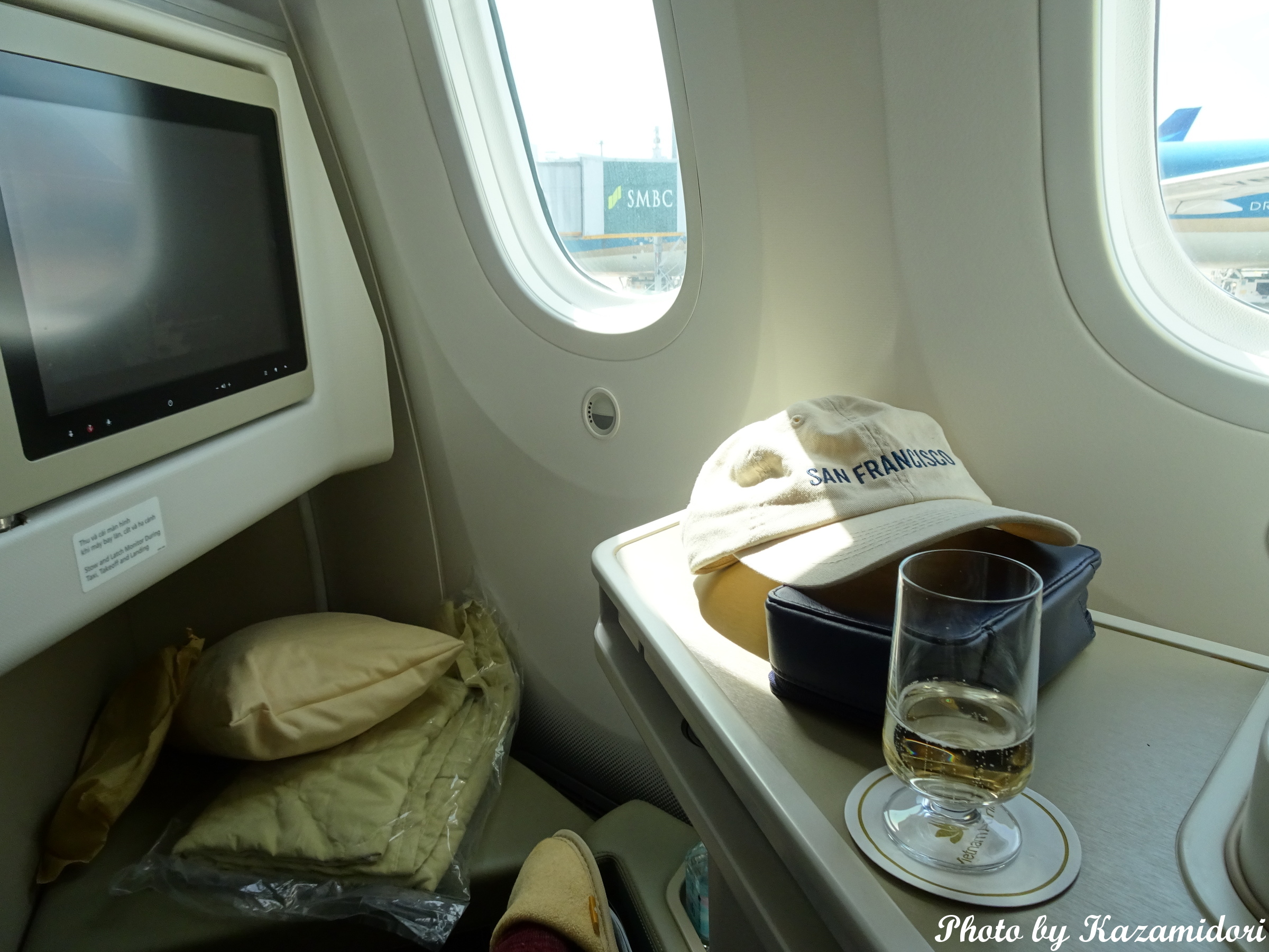 最近、個室タイプの座席になれていたので、デルタでも以前使っていた、このタイプのシートは久しぶり。シートが斜めになっているので、離陸時とかちょっと違和感がある。ほぼ定刻にゲートを離れたのだが、滑走路手前でかなり長時間待たされた。ひとつ前にいたベトナムのLCCの機体が、滑走路に入ってからいつまでも離陸せず、ちょっと気をもんだ。何が原因だったのか、昨日は羽田で管制システムのトラブルがあったので、なんとなく嫌な雰囲気もしたのだが、20分ほど待っただろうか、どうにか離陸することができた。